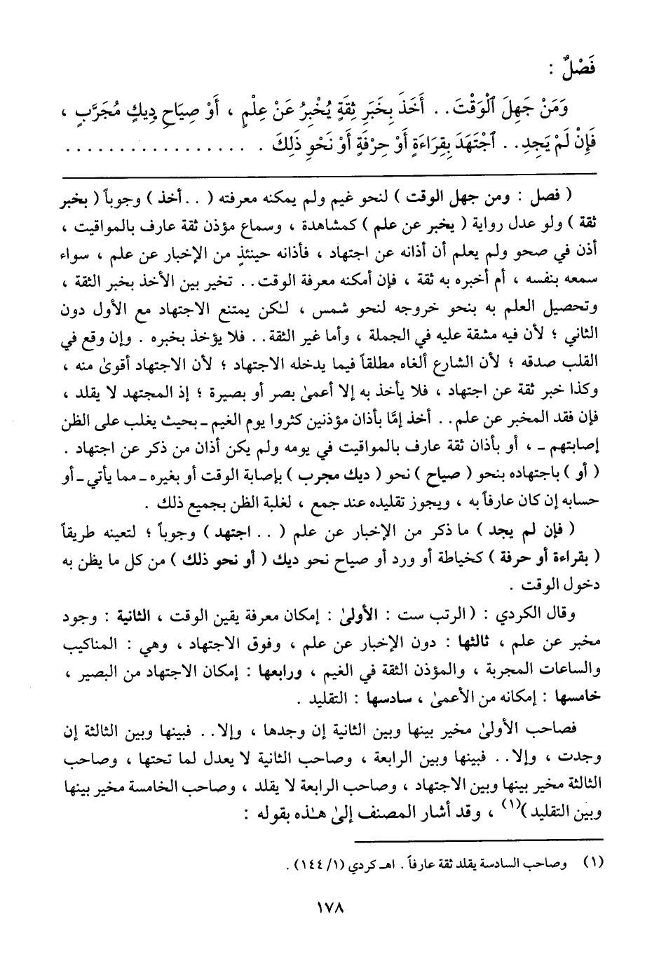 وقال الكردي: (الرتب ستة: الأولى: إمكان معرفة يقين الوقت، الثانية: وجود مخبر عن علم، ثالثها: دون الإخبار عن علم، وفوق الاجتهاد، وهي: المناكيب والساعات المجربة، والمؤذن الثقة في الغيم، ورابعها: إمكان الاجتهاد من البصير، خامسها: إمكانه من الأعمى، سادسها: التقليد.