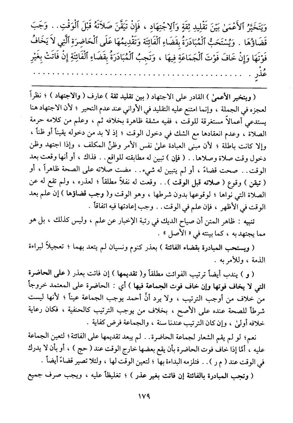 (و) يندب أيضاً ترتيب الفوائت مطلقاً و (تقديمها) إن فاتت بعذر (على الحاضرة التي لا يخاف فوتها وإن خاف فوت الجماعة فيها) أي: الحاضرة على المعتمد خروجاً من خلاف من أوجب الترتيب، ولا يرد أن أحمد يوجب الجماعة عيناً؛ لأنها ليست شرطاً للصحة عنده على الأصح، بخلاف من يوجب الترتيب كالحنفية، فكان رعاية خلافه أولى، وإن كان الترتيب عندنا سنة، والجماعة فرض كفاية.