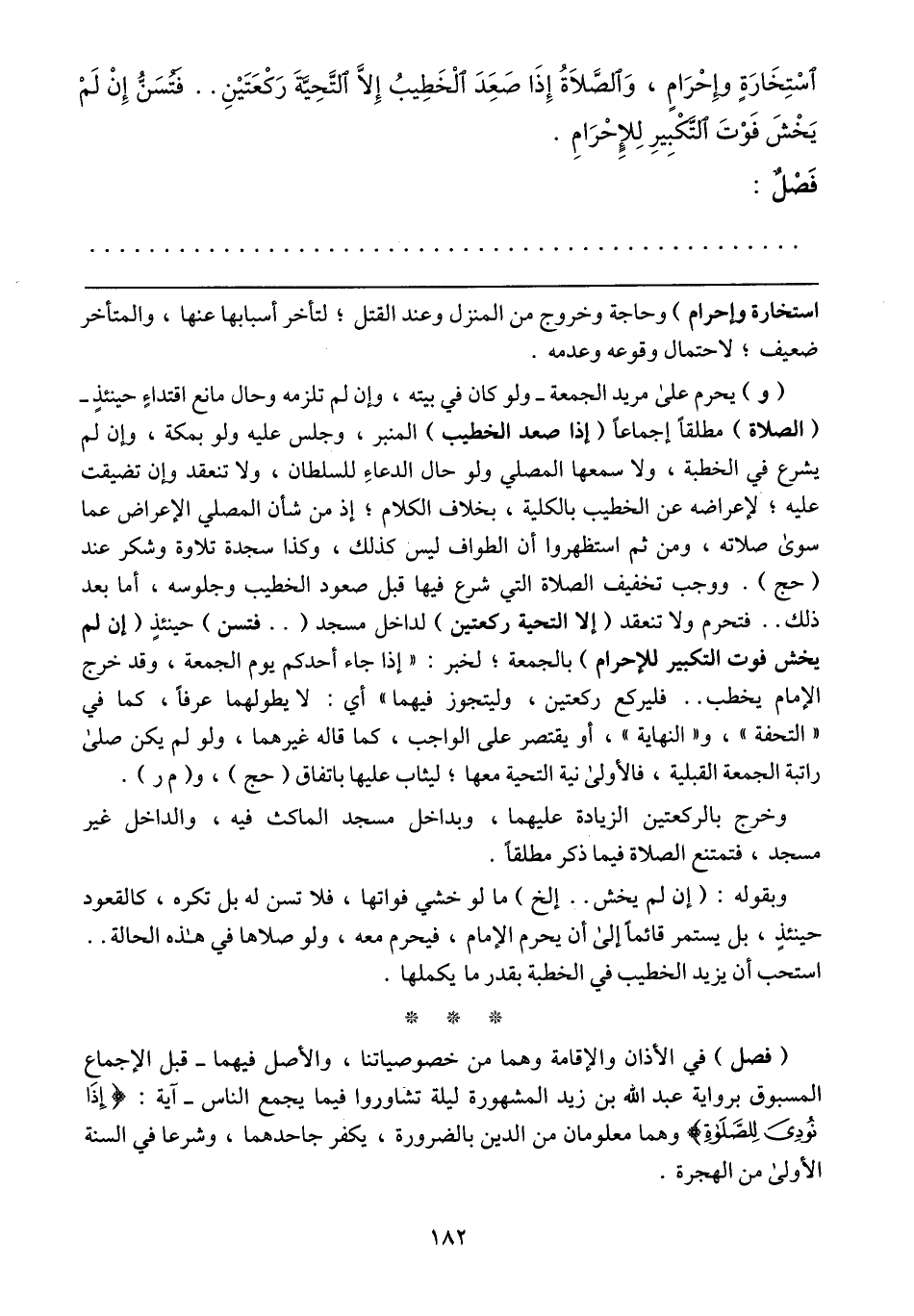 (و) يحرم على مريد الجمعة -ولو كان في بيته، وإن لم تلزمه وحال مانع اقتداءٍ حينئذٍ- (الصلاة) مطلقاً إجماعاً (إذا صعد الخطيب) المنبر، وجلس عليه ولو بمكة، وإن لم يشرع في الخطبة، ولا سمعها المصلي ولو حال الدعاءِِ للسلطان، ولا تنعقد وإن تضيقت عليه؛ لإعراضه عن الخطيب بالكلية، بخلاف الكلام؛ إذ من شأن المصلي الإعراض عما سوى صلاته، ومن ثم استظهروا أن الطواف ليس كذلك، وكذا سجدة تلاوة وشكر عند (حج).