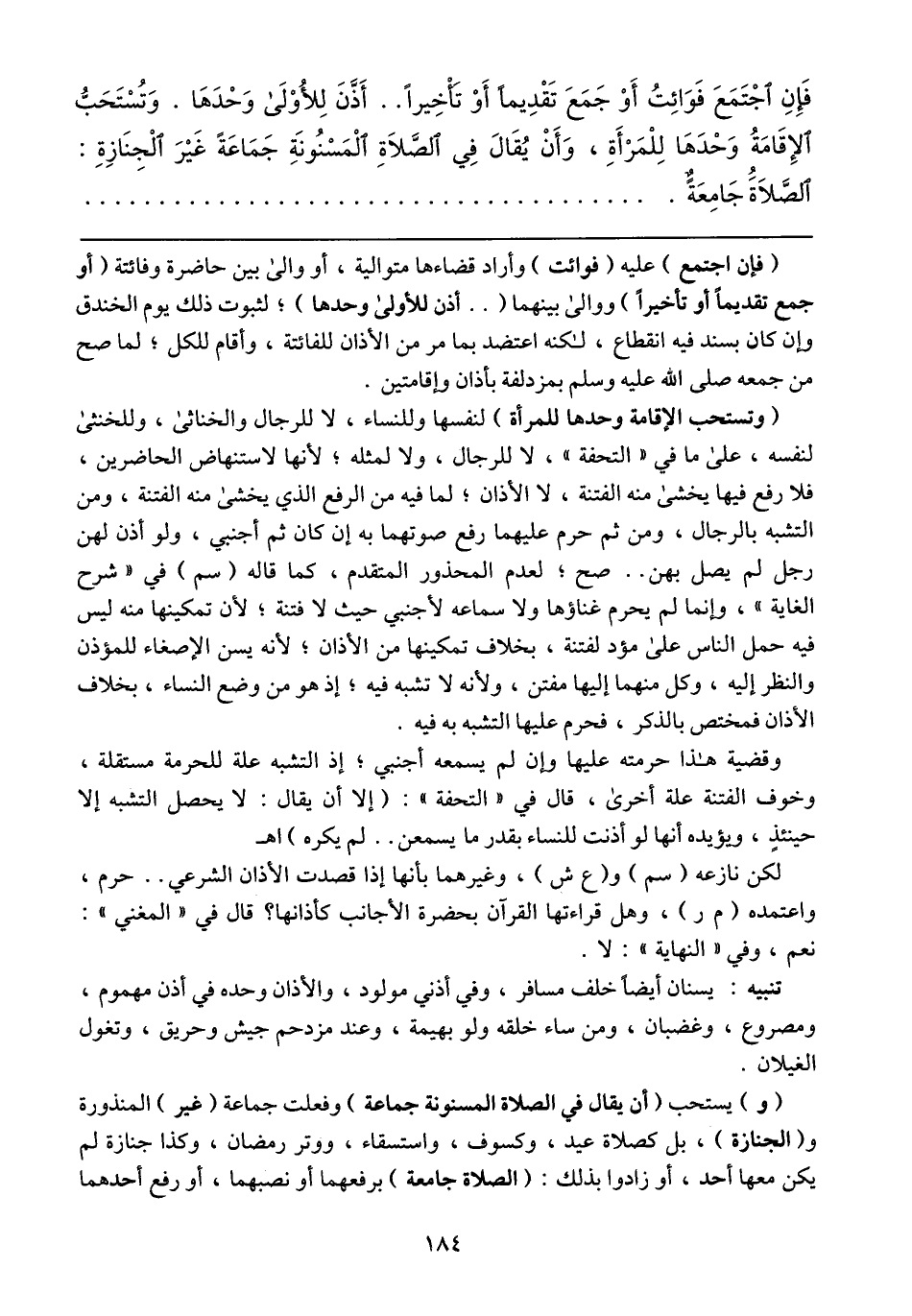 (وتستحب الإقامة وحدها للمرأة) لنفسها وللنساء، لا للرجال والخناثى، وللخنثى لنفسه، على ما في "التحفة" لا للرجال، ولا لمثله؛ لأنها لاستنهاض الحاضرين، فلا رفع فيها يخشى منه الفتنة، لا الأذان؛ لما فيه من الرفع الذي يخشى منه الفتنة؛ ومن التشبه بالرجال، ومن ثم حرم عليهما رفع صوتهما به إن كان ثم أجنبي، لو أذن لهن رجل لم يصل بهن .. صح؛ لعدم المحذور المتقدم، كما قال (سم) في "شرح الغاية"، وإنما لم يحرم غناؤها ولا سماعه لأجنبي حيث لا فتنه؛ لأن تمكينها منه ليس فيه حمل الناس على مؤد لفتنة، بخلاف تمكينها من الأذان؛ لأنه يسن الإصغاء للمؤذن والنظر إليه، وكل منهما إليها مفتن، ولأنه لا تشبه فيه؛ إذ هو من وضع النساء، بخلاف الأذان فمختص بالذكر، فحرم عليها التشبه به فيه.