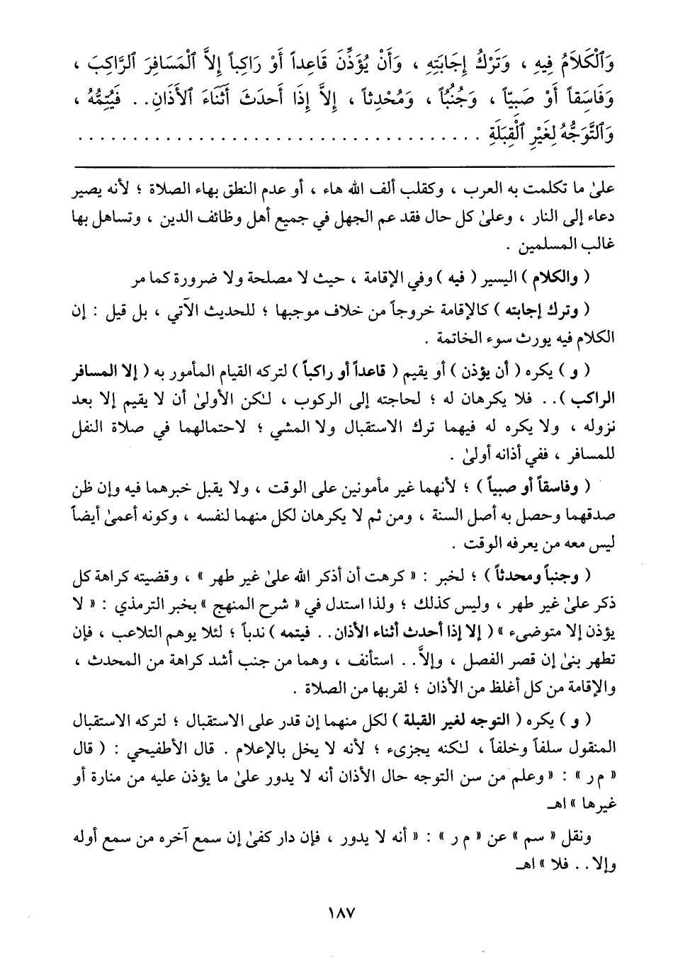 (و) يكره (أن يؤذن) أو يقيم (قاعداً أو راكباً) لتركه القيام المأمور به (إلا المسافر الراكب) .. فلا يكرهان له؛ لحاجته إلى الركوب، لكن الأولى أن لا يقيم إلا بعد نزوله، ولا يكره له فيهما ترك الاستقبال ولا المشي؛ لاحتمالهما في صلاة النفل للمسافر، ففي أذانه أولى.