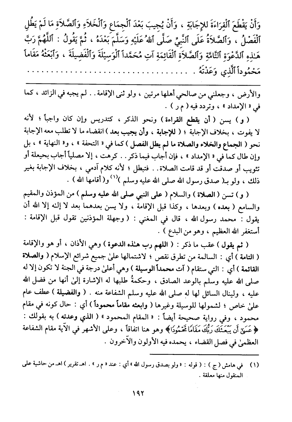 (و) يسن (أن يقطع القراءة) ونحو الذكر، كتدريس وإن كان واجباً؛ لأنه لا يفوت، بخلاف الإجابة؛ (للإجابة، وأن يجيب بعد) انقضاء ما لا تطلب معه الإجابة نحو (الجماع والخلاء والصلاة ما لم يطل الفصل) كما في "التحفة"، و"النهاية"، بل وأن طال كما في "الإمداد"، فإن أجاب فيما ذكر .. كرهت، إلا مصلياً أجاب بحيعلة أو تثويب أو صدقت أو قد قامت الصلاة .. فتبطل؛ لأنه كلام آدمي، بخلاف الإجابة بغير ذلك ولو بـ (صدق رسول الله صلى الله عليه وسلم) و (أقامها الله).