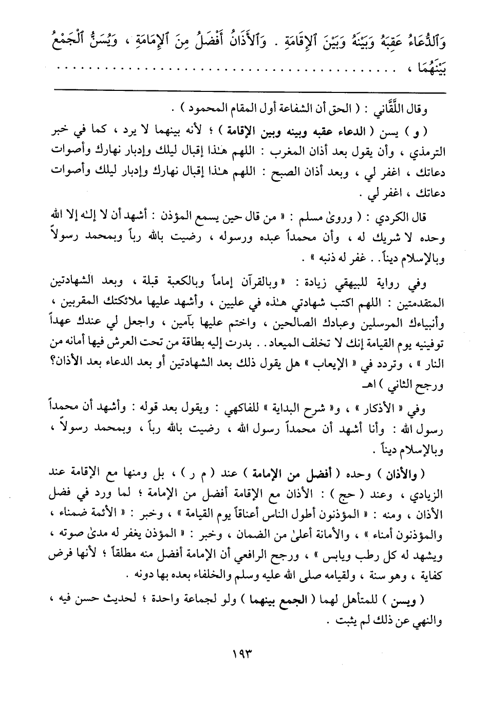 (و) يسن (الدعاء عقبه وبينه وبين الإقامة)؛ لأنه بينهما لا يرد، كما في خبر الترمذي، وأن يقول بعد أذان المغرب: اللهم هذا إقبال ليلك وإدبار نهارك وأصوات دعاتك، اغفر لي، وبعد أذان الصبح: اللهم هذا إقبال نهارك وإدبار ليلك وأصوات دعاتك، اغفر لي.