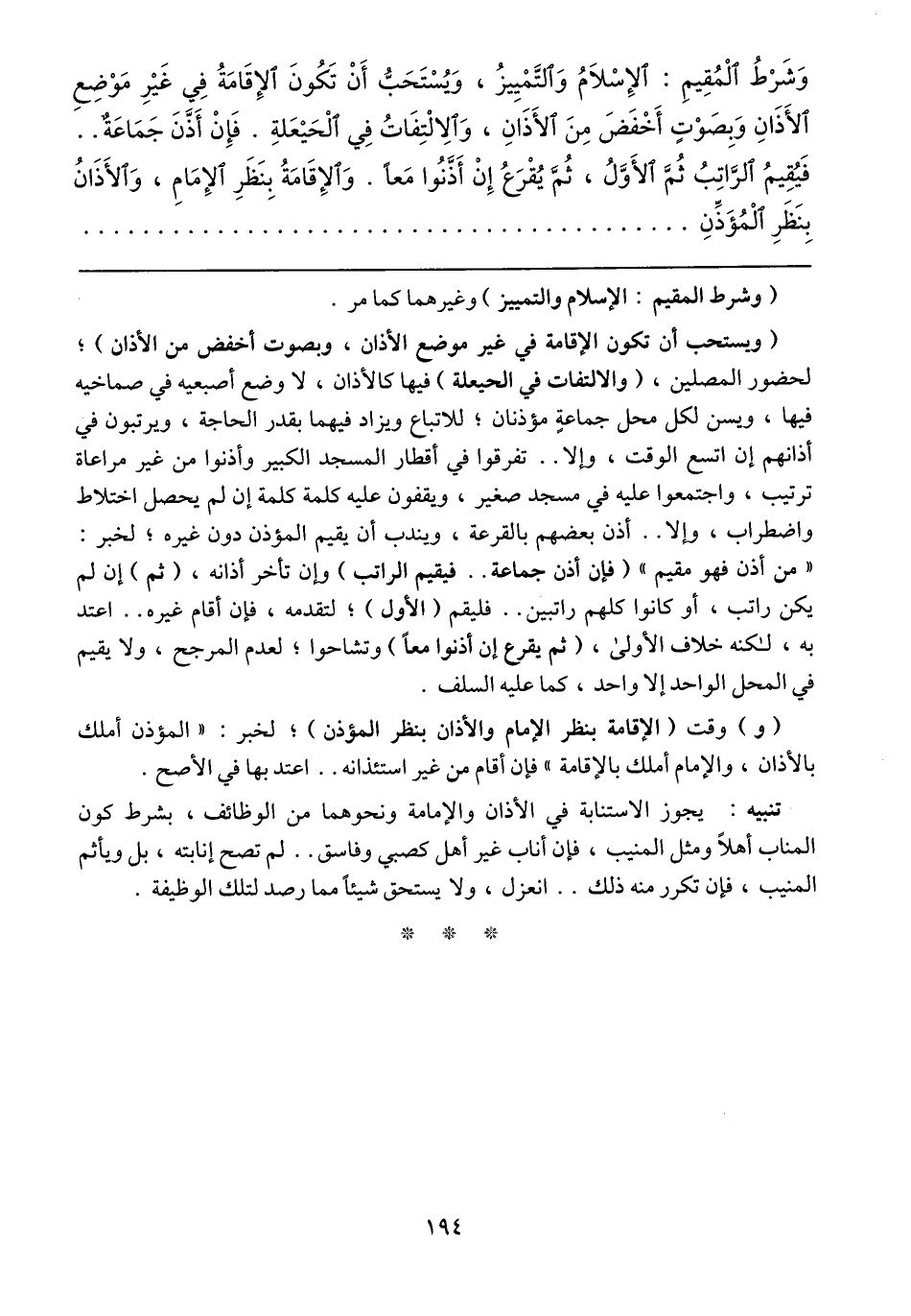 تنبه: يجوز الاستنابة في الأذان والإمامة ونحوهما من الوظائف، بشرط كون المناب أهلاً ومثل المنيب، فإن أناب غير أهلٍ كصبي وفاسق .. لم تصح إنابته، بل ويأثم المنيب، فإن تكرر منه ذلك .. انعزل، ولا يستحق شيئاً مما رصد لتلك الوظيفة.