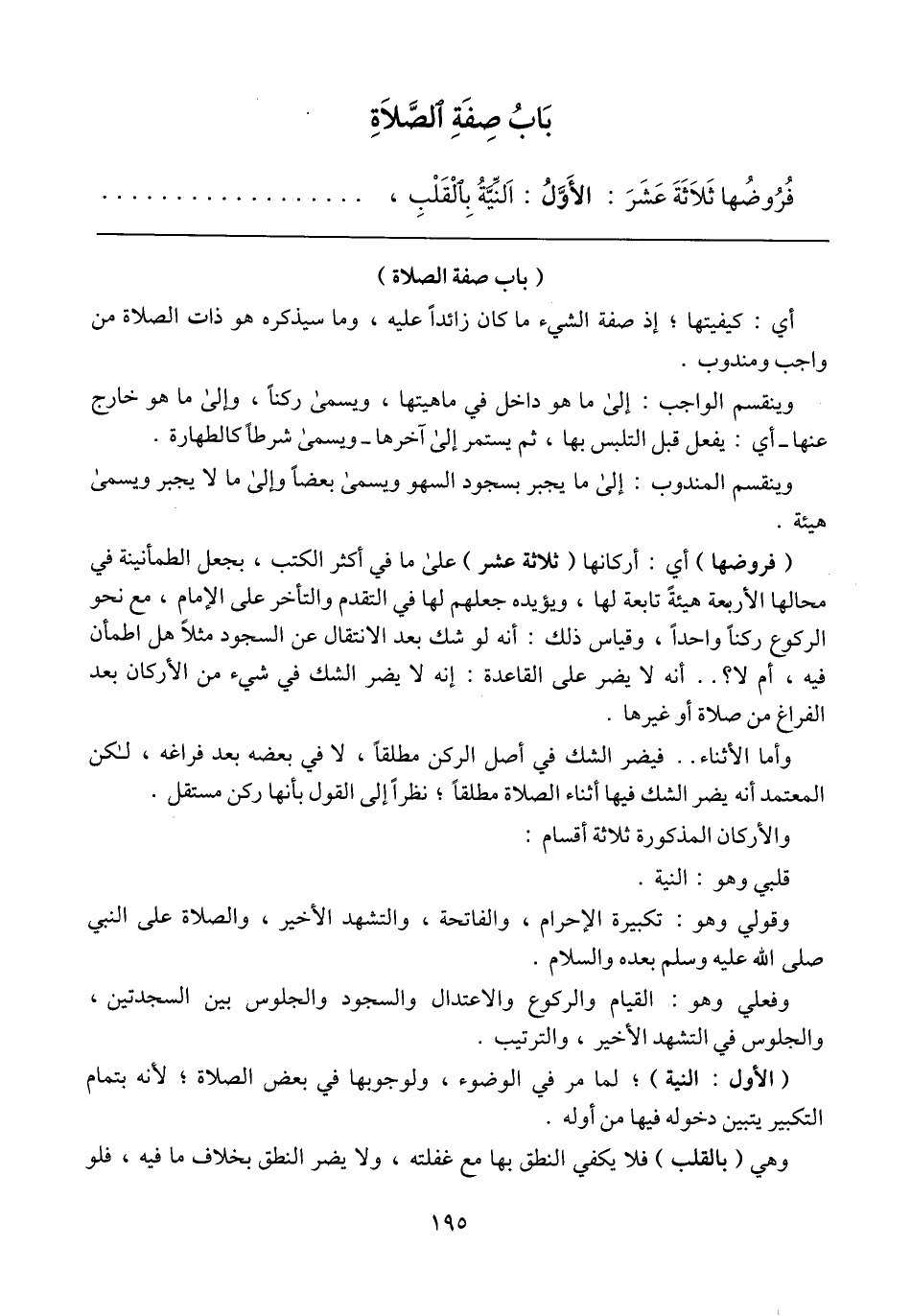 (فروضها) أي: أركانها (ثلاثة عشر) على ما في أكثر الكتب، يجعل الطمأنينة في محالها الأربعة هيئةً تابعة لها، ويؤيده جعلهم لها في التقدم والتأخر على الإمام، مع نحو الركوع ركناً واحداً، وقياس ذلك: أنه لو شك بعد الانتقال عن السجود مثلاً هل اطمأن فيه، أم لا؟ .. أنه لا يضر على القاعدة: إنه لا يضر الشك في شيء من الأركان بعد الفراغ من صلاة أو غيرها.