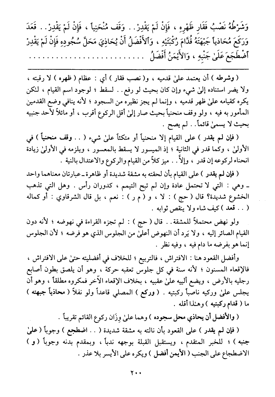 (وشرطه) أن يعتمد على قدميه، و (نصب فقار) أي: عظام (ظهره) لا رقبته، ولا يضر استناده إلى شيء وأن كان بحيث لو رفع .. لسقط؛ لوجود اسم القيام، لكن يكره كقيامه على ظهر قدميه، وإنما لم يجز نظيره من السجود؛ لأنه ينافي وضع القدمين المأمور به فيه، ولو وقف منحنياً بحيث صار إلى أقل الركوع أقرب، أو مائلاً لأحد جنبيه بحيث لا يسمى قائماً .. لم يصح.