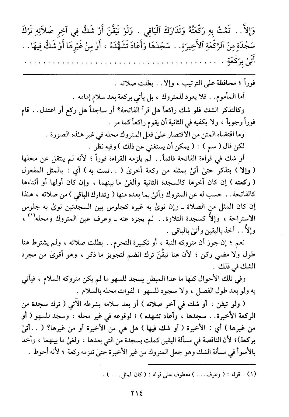 أو شك في قراءة الفاتحة قائماً .. لم يلزمه القراءة فوراً؛ لأنه لم ينتقل عن محلها (وإلا) يتذكر حتى أتى بمثله من ركعة أخرى ( .. تمت به) أي: بالمثل المفعول (ركعته) إن كان آخرها كالسجدة الثانية وألغى ما بينهما، وإن كان أولها أو أثناءها كالفاتحة .. حسب له عن المتروك وأتى بما بعده منها (وتدارك الباقي) من صلاته، هذا إن كان المثل من الصلاة -وإن نوى به غيره كجلوس بين السجدتين نوى به جلوس الاستراحة، وإلاَّ كسجدة التلاوة .. لم يجزه عنه- وعرف عين المتروك ومحله، وإلاَّ .. أخذ باليقين وأتى بالباقي.
