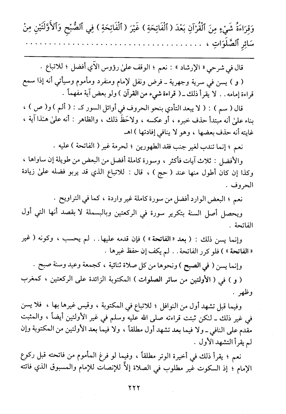 (و) يسن في سرية وجهرية -فرض ونفل لإمام ومنفرد ومأموم وسيأتي أنه إذا سمع قراءة إمامه .. لا يقرأ ذلك- (قراءة شيء من القرآن) ولو بعض آية مفهماً.