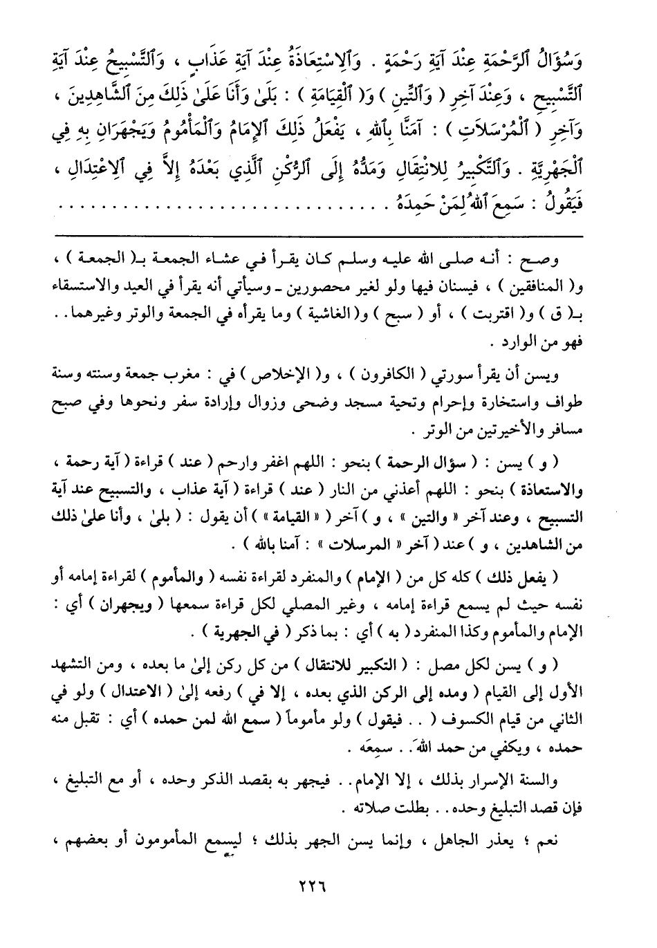 (و) يسن: (سؤال الرحمة) بنحو: اللهم اغفر وارحم (عند) قراءة (آية رحمة، والاستعاذة) بنحو: اللهم أعذني من النار (عند) قراءة (آية عذاب، والتسبيح عند آية التسبيح، وعند آخر "والتين"، و) آخر ("القيامة") أن يقول: (بلى، وأنا على ذلك من الشاهدين، و) عند (آخر "المرسلات": آمنا بالله).