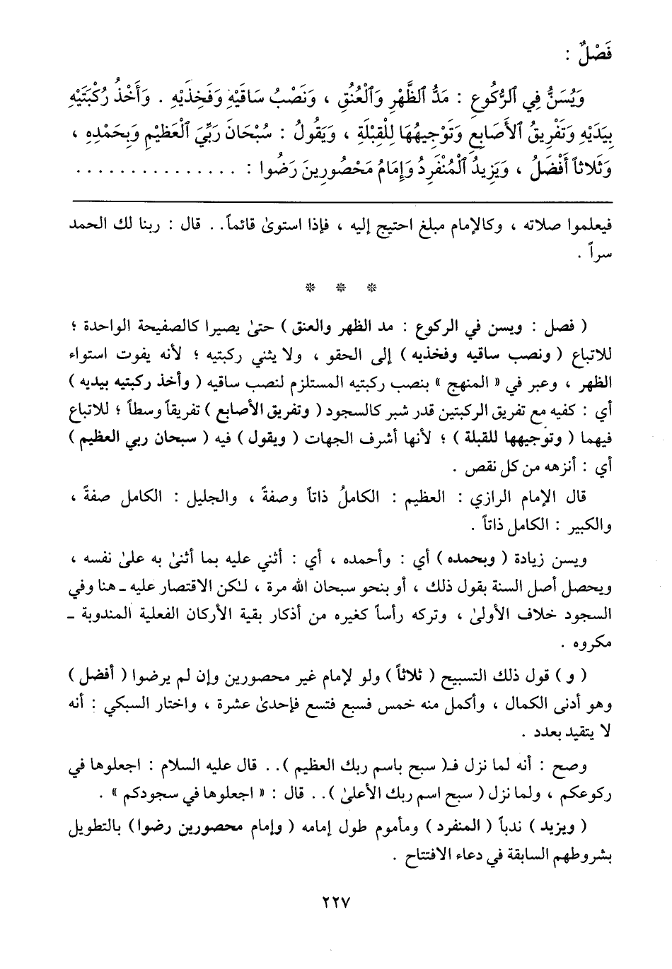 (فصل: ويسن في الركوع: مد الظهر والعنق) حتى يصيرا كالصفيحة الواحدة؛ للاتباع (ونصب ساقيه وفخذيه) إلى الحقو، ولا يثني ركبتيه؛ لأنه يفوت استواء الظهر، وعبر في "المنهج" بنصب ركبتيه المستلزم لنصب ساقيه (وأخذ ركبتيه بيديه) أي: كفيه مع تفريق الركبتين قدر شبر كالسجود (وتفريق الأصابع) تفريقاً وسطاً؛ للاتباع فيهما (وتوجيهها للقبلة)؛ لأنها أشرف الجهات (ويقول) فيه (سبحان ربي العظيم) أي: أنزهه من كل نقص.