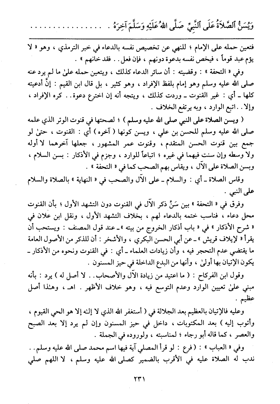 (ويسن الصلاة على النبي صلى الله عليه وسلم)؛ لصحتها في قنوت الوتر الذي علمه صلى الله عليه وسلم للحسن بن علي، ويسن كونها (آخره) أي: القنوت، حتى لو جمع بين قنوت الحسن المتقدم، وقنوت عمر المشهور، جعلها آخرهما لا أوله ولا وسطه وإن سنت فيهما في غيره؛ اتباعاً للوارد، وجزم في الأذكار: بسن السلام، وبسن الصلاة على الآل، ويقاس بهم الصحب كما في "التحفة".