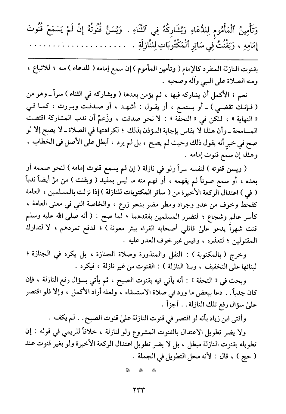 بقنوت النازلة المنفرد كالإمام (وتأمين المأموم) إن سمع إمامه (للدعاء) منه؛ للاتباع، ومنه الصلاة على النبي وآله وصحبه.
