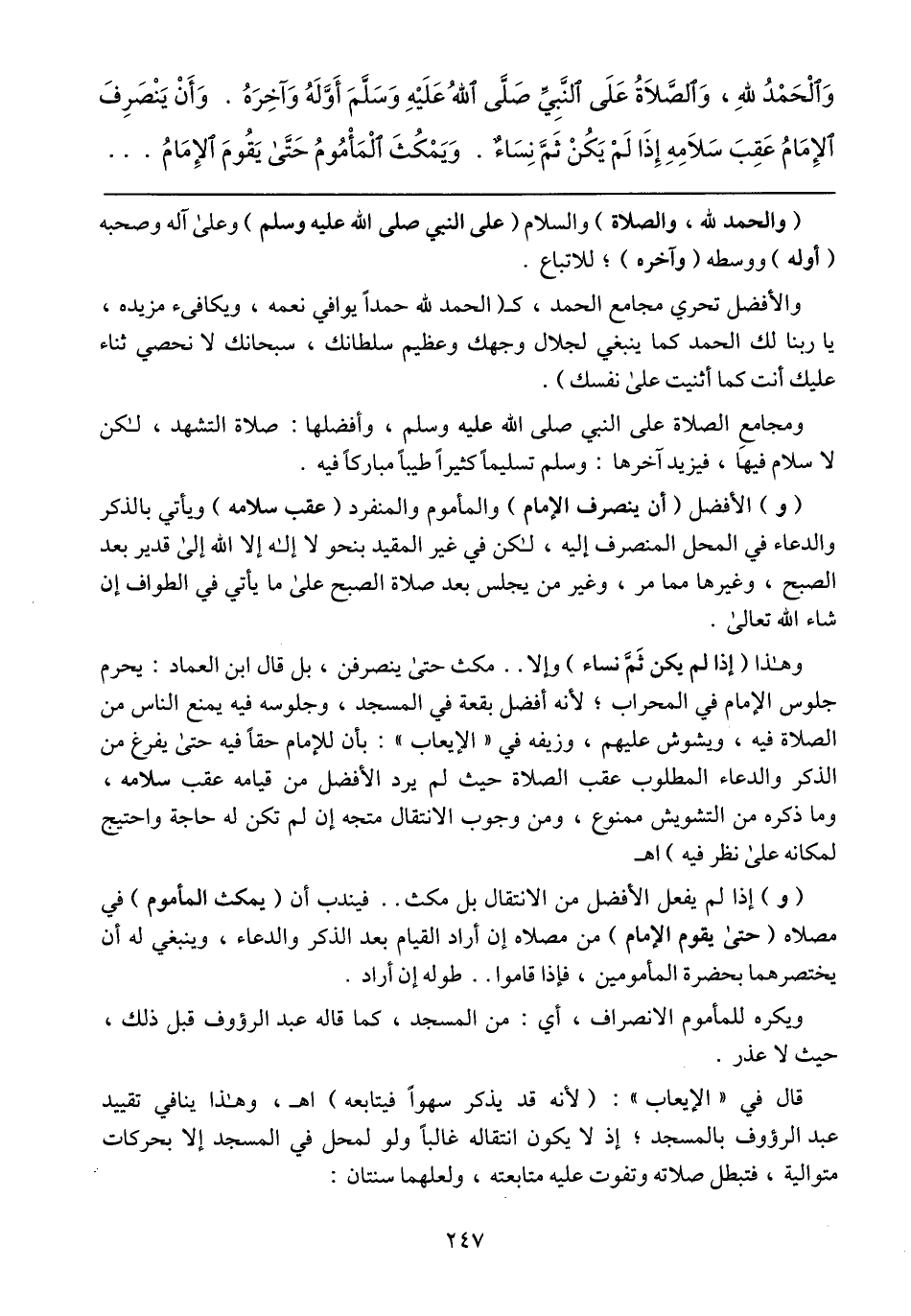وهذا (إذا لم يكن ثَمَّ نساء) وإلا .. مكث حتى ينصرفن، بل قال ابن العماد: يحرم جلوس الإمام في المحراب؛ لأنه أفضل بقعة في المسجد، وجلوسه فيه يمنع الناس من الصلاة فيه، ويشوش عليهم، وزيفه في "الإيعاب": بأن للإمام حقاً فيه حتى يفرغ من الذكر والدعاء المطلوب عقب الصلاة حيث لم يرد الأفضل من قيامه عقب سلامه، وما ذكره من التشويش ممنوع، ومن وجوب الانتقال متجه إن لم تكن له حاجة واحتيج لمكانه على نظر فيه) اهـ