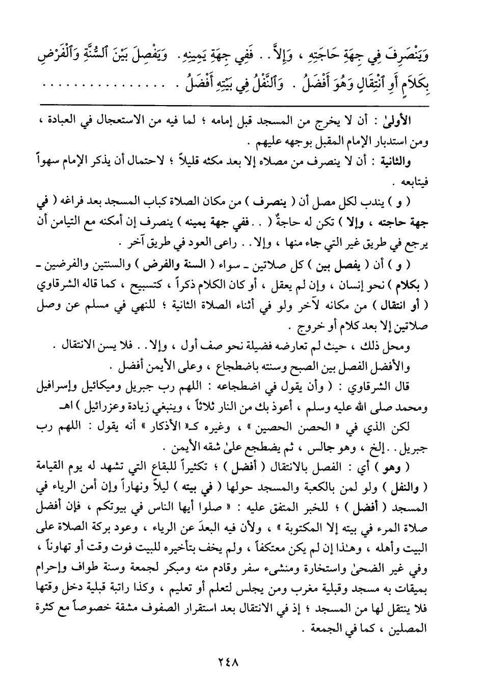 (و) يندب لكل مصل أن (ينصرف) من مكان الصلاة كباب المسجد بعد فراغه (في جهة حاجته، وإلا) تكن له حاجةٌ ( .. ففي جهة يمينه) ينصرف إن أمكنه مع التيامن أن يرجع في طريق غير التي جاء منها، وإلا .. راعى العود في طريق آخر.
