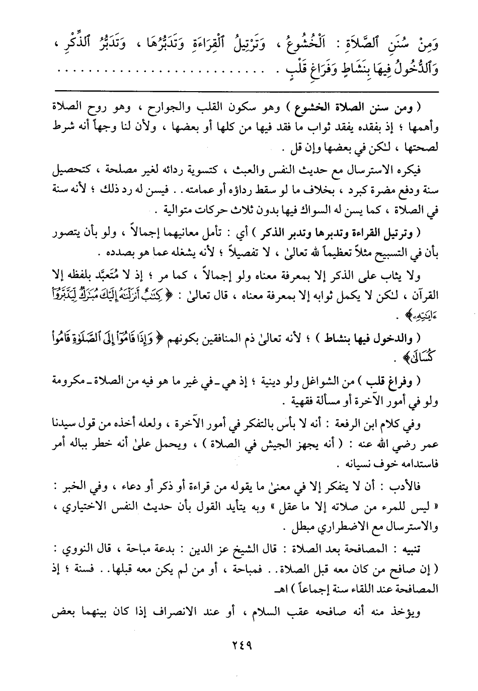 (ومن سنن الصلاة الخشوع) وهو سكون القلب والجوارح، وهو روح الصلاة وأهمها؛ إذ بفقده يفقد ثواب ما فقد فيها من كلها أو بعضها، ولأن لنا وجهاً أنه شرط لصحتها، لكن في بعضها وإن قل.