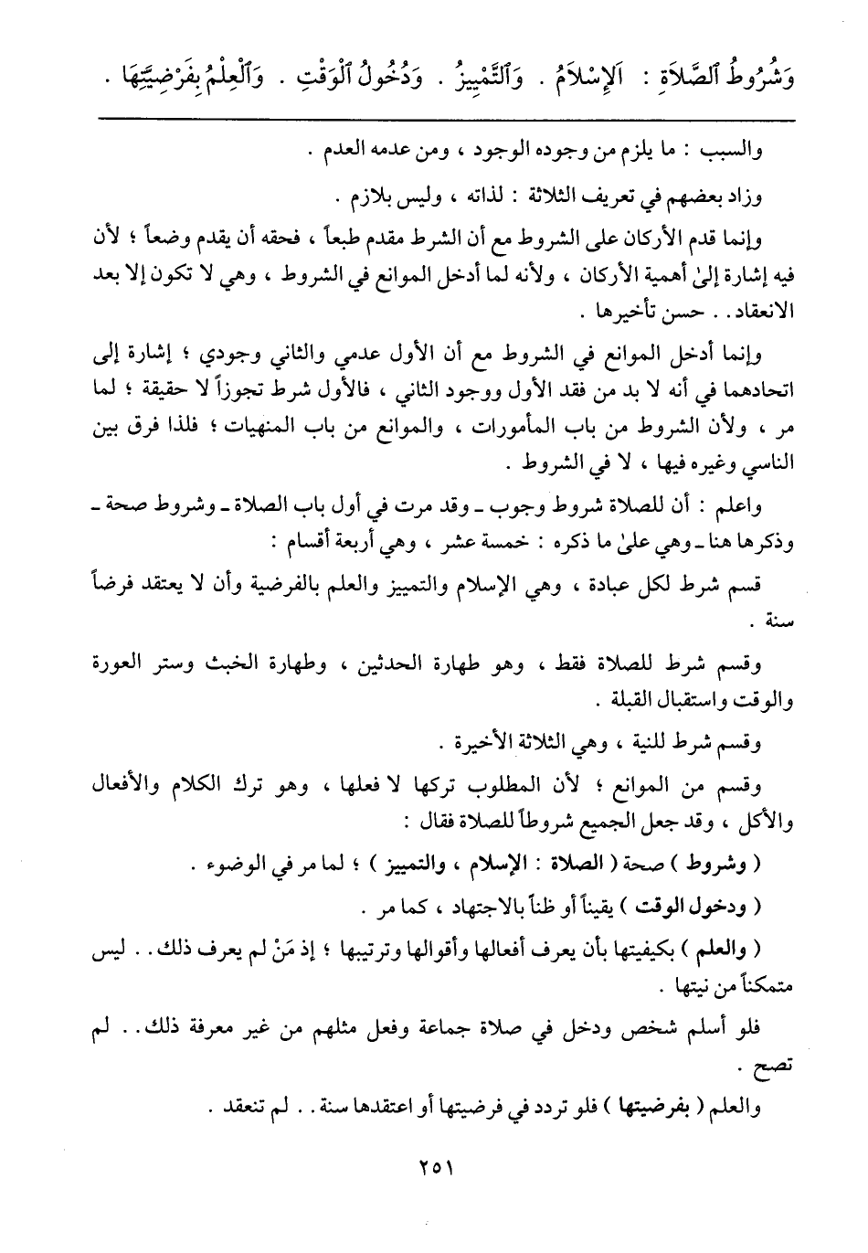 قسم شرط لكل عباده، وهي الإسلام والتميز والعلم بالفرضية وأن لا يعتقد فرضاً سنة.