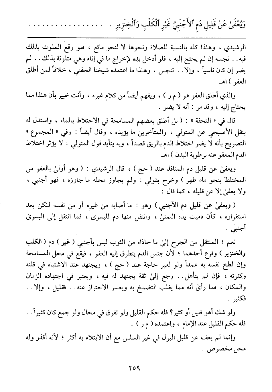 قال في "التحفة": (بل أطلق بعضهم المسامحة في الاختلاط بالماء، واستدل له بنقل الأصبحي عن المتولي، والمتأخرين ما يؤيده، وقال أيضاً: وفي "المجموع" التصريح بأنه لا يضر اختلاط الدم بالريق قصداً، وبه يتأيد قول المتولي: لايؤثر اختلاط الدم المعفو عنه برطوبة البدن) اهـ
