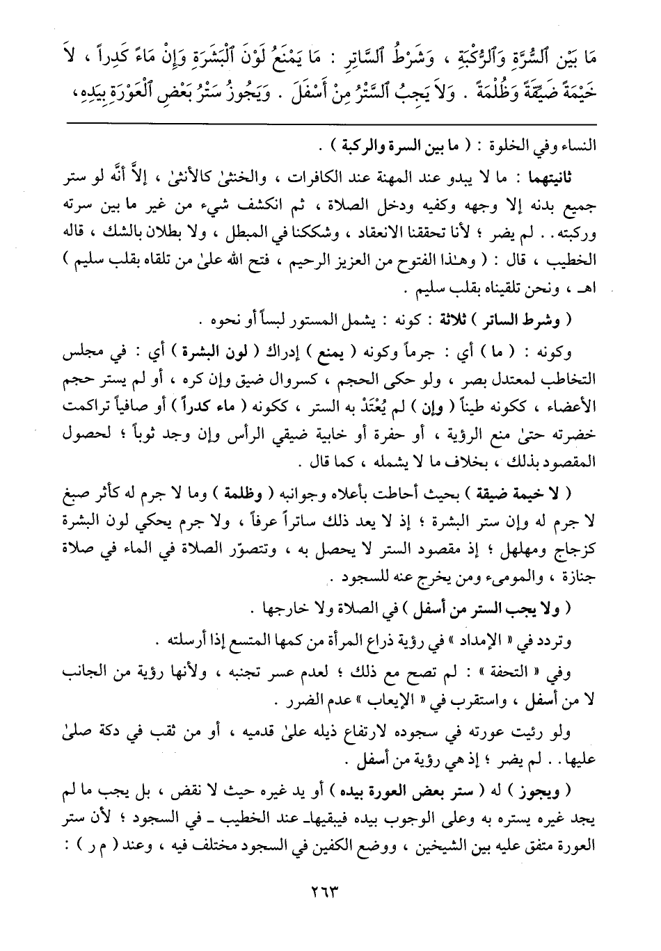 ثانيتهما: ما لايبدو عند المهنة عند الكافرات، والخنثى كالأنثى، إلاَّ أنَّه لو ستر جميع بدنه إلا وجهه وكفيه ودخل الصلاة، ثم انكشف شيء من غير ما بين سرته وركبته .. لم يضر؛ لأن تحققنا الانعقاد، وشككنا في المبطل، ولا بطلان بالشك، قاله الخطيب، قال: (وهذا الفتوح من العزيز الرحيم، فتح الله على من تلقاه بقلب سليم) اهـ، ونحن تلقيناه بقلب سليم.