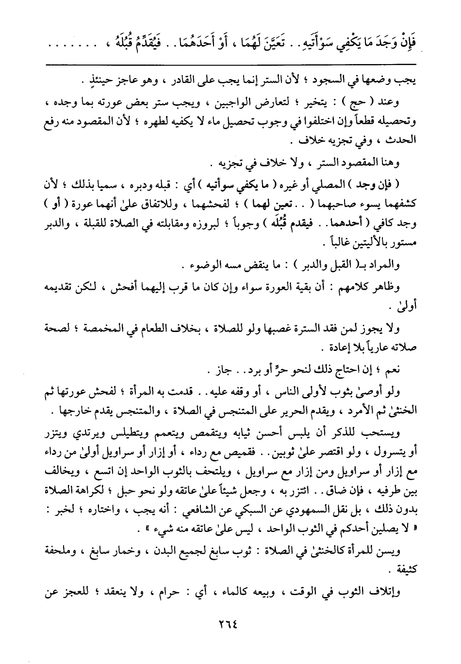 (فإن وجد) المصلي أو غيره (ما يكفي سوأتيه) أي: قبله ودبره، سميا بذلك؛ لأن كشفهما يسوء صاحبهما ( .. تعين لهما)؛ لفحشهما، وللاتفاق على أنهما عورة (أو) وجد كافي (أحدهما .. فيقدم قُبُلَه) وجوباً؛ لبروزه ومقابلته في الصلاة للقبلة، والدبر مستور بالأليتين غالباً.
