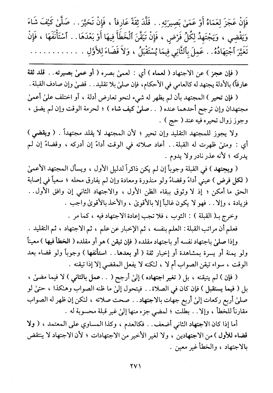أمَا إذا كان الاجتهاد الثاني أضعف .. فكالعدم، وكذا المساوي على المعتمد، (ولا قضاء للأول) من الاجتهادين، ولا لغير الأخير من الاجتهادات؛ لأن الاجتهاد لا ينتقض بالاجتهاد، والخطأ غير معين.