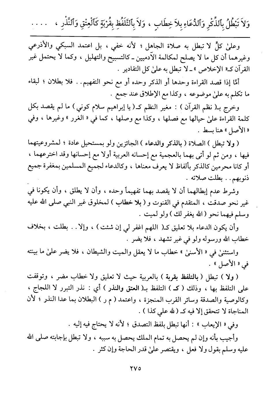 (ولا تبطل) الصلاة (بالذكر والدعاء) الجائزين ولو بمستحيل عادة؛ لمشروعيتهما فيها، ومن ثم لو أتى بهما بالعجمية مع إحسانه العربية أو لا من إحسانها وقد اخترعها، أو كانا محرمين كالذكر بألفاظ لا يعرف معناها، وكالدعاء لجميع المسلمين بمغفرة جميع ذنوبهم .. بطلت صلاته.