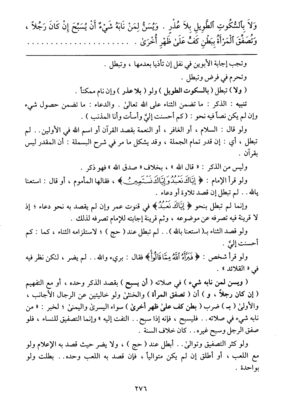 (ويسن لمن نابه شيء) في صلاته (أن يسبح) بقصد الذكر وحده، أو مع التفهيم (إن كان رجلاً، و) أن (تصفق المرأة) والخنثى ولو خاليتين عن الرجال الأجانب، والأولى (بـ) ضرب (بطن كف على ظهر أخرى) سواء اليسرى واليمنى؛ لخبر: "من نابه شيء في صلاته .. فليسبح، فإنه إذا سبح .. التفت إليه" وإنما التصفيق للنساء، فلو صفق الرجل وسبح غيره .. كان خلاف السنة.