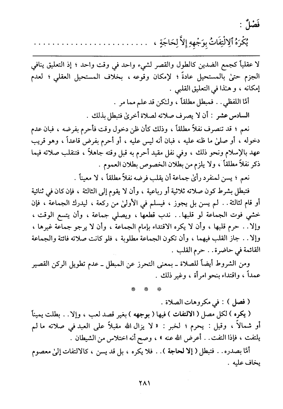 (يكره) لكل مصل (الالتفات) فيها (بوجهه) بغير قصد لعب، وإلا .. بطلت يميناً أو شمالاً، وقيل: يحرم؛ لخبر: "لايزال الله مقبلاً على العبد في صلاته ما لم يلتفت، فإذا التفت .. أعرض الله عنه"، وصح أنه اختلاس من الشيطان.