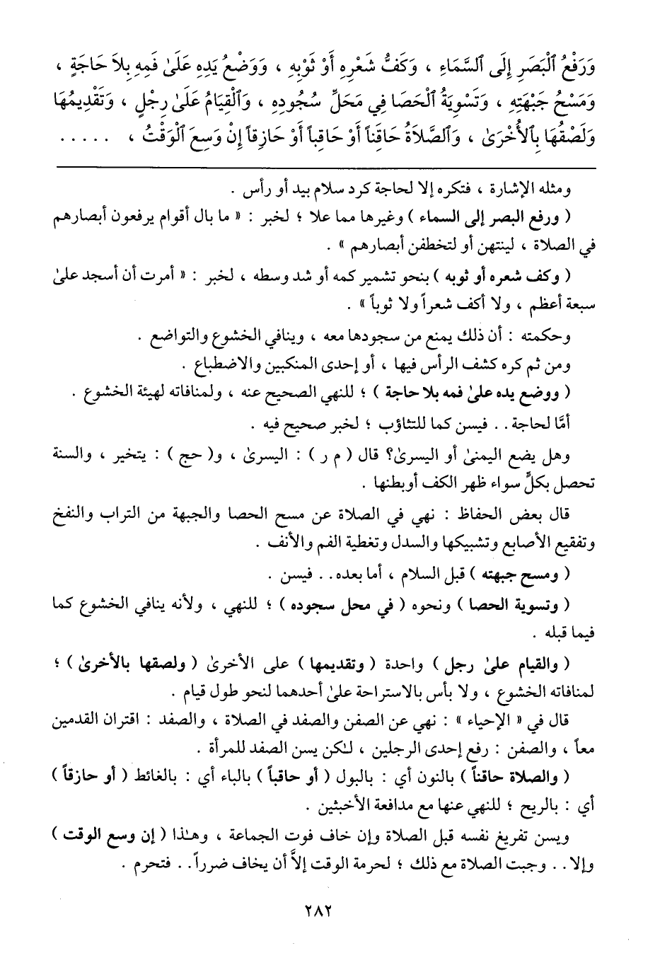 فال بعض الحفاظ: نهي في الصلاة عن مسح الحصا والجبهة من التراب والنفخ وتفقيع الأصابع وتشبيكها والسدل وتغطية الفم والأنف.