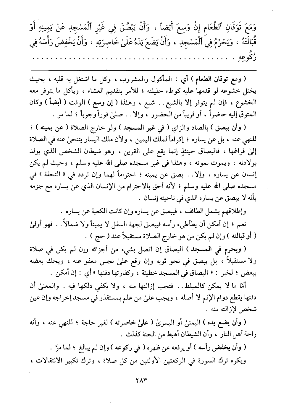 (وأن يبصق) بالصاد والزاي (في غير المسجد) ولو خارج الصلاة (عن يمينه)؛ للنهي عنه، بل عن يساره؛ إكراماً لملك اليمين، ولأن ملك اليسار يتنحى عنه في الصلاة إلى فراغها، فالبصاق حينئذٍ إنما يقع على القرين، وهو شيطان الشخص الذي يولد بولادته، ويموت بموته، وهذا في غير مسجده صلى الله عليه وسلم، وحيث لم يكن إنسان عن يساره، وإلا .. بصق عن يمينه؛ احتراماً لهما وإن تردد في "التحفة" في مسجده صلى الله عليه وسلم؛ لأنه أحق بالاحترام من الأنسان الذي عن يساره مع جزمه بأنه لا يبصق عن يساره الذي في ناحيته إنسان.