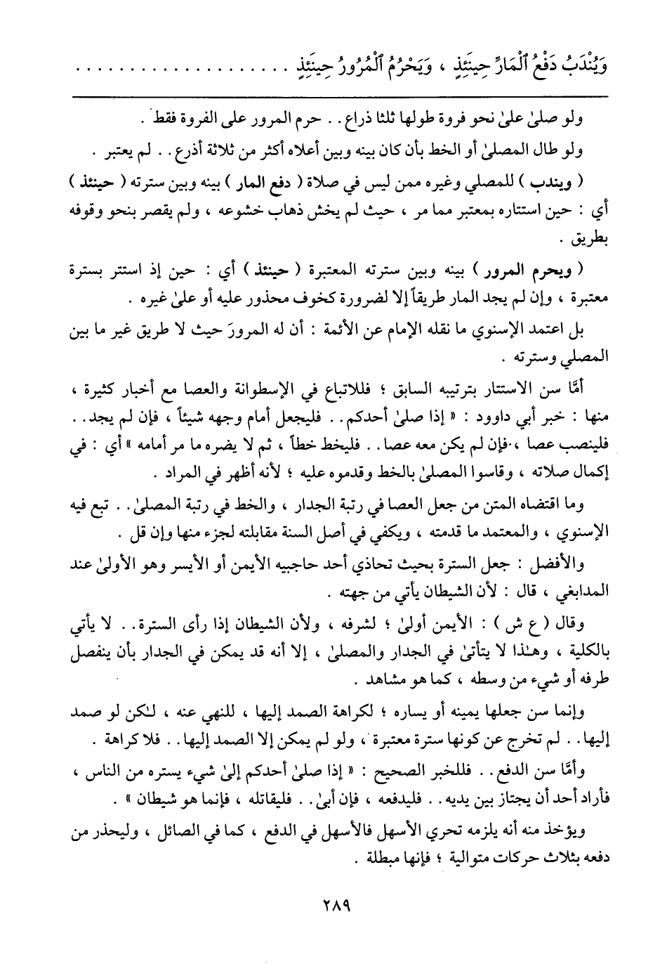 (ويندب) للمصلي وغيره ممن ليس في صلاة (دفع المار) بينه وبين سترته (حينئذٍ) أي: حين استتاره بمعتبر مما مر، حيث لم يخش ذهاب خشوعه، ولم يقصر بنحو وقوفه بطريق.