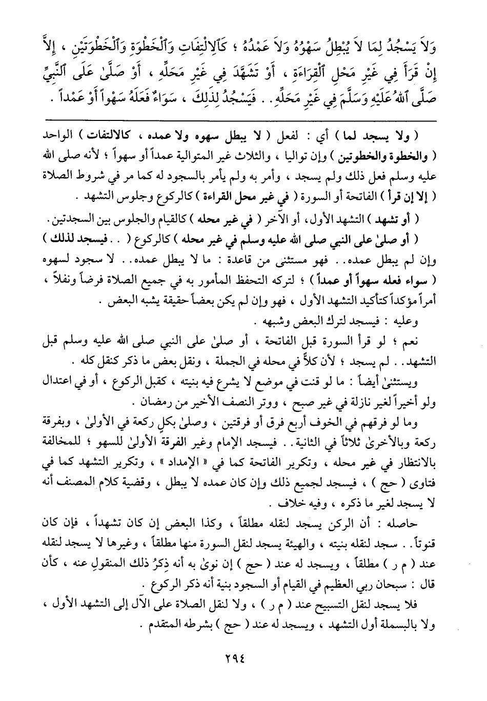 (ولا يسجد لما) أي: لفعل (لا يبطل سهوه ولا عمده، كالالتفات) الواحد (والخطوة والحطوتين) وإن تواليا، والثلاث غير متوالية عمداً أو سهواً؛ لأنه صلى الله عليه وسلم فعل ذلك ولم يسجد، وأمر به ولم يأمر بالسجود له كما مر في شروط الصلاة (إلا إن قرأ) الفاتحة أو السورة (في غير محل القراءة) كالركوع وجلس التشهد.