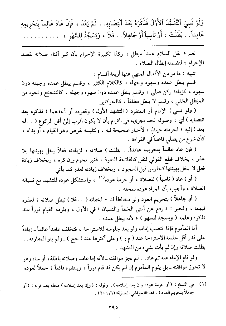 (أو) عاد (ناسياً) للصلاة، أو حرمة عوده، واستشكل عوده للتشهد مع نسيانه الصلاة، وأجيب بأن المراد عوده لمحله.