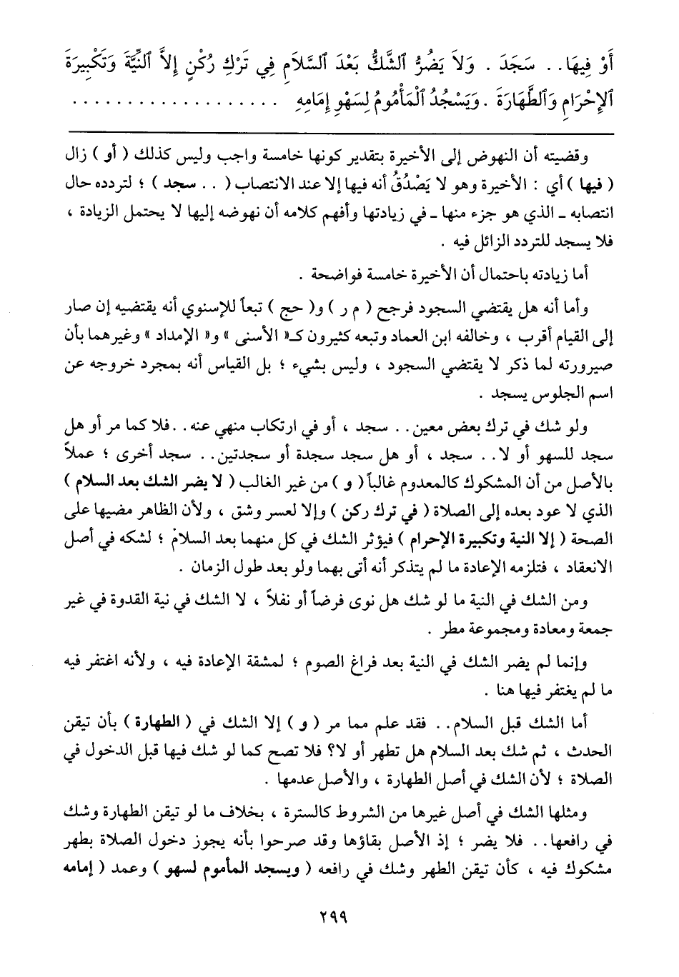 ولو شك في ترك بعض معين .. سجد، أو في إرتكاب منهي عنه .. فلا كما مر أو هل سجد للسهو أو لا .. سجد، أو هل سجد سجدة أو سجدتين .. سجد أخرى؛ عملاً بالأصل من أن المشكوك كالمعدوم غالباً (و) من غير الغالب (لا يضر الشك بعد السلام) الذي لا عود بعده إلى الصلاة (في ترك ركن) وإلا لعسر وشق، ولأن الظاهر مضيها على الصحة (إلا النية وتكبيرة الإحرام) فيؤثر الشك في كل منهما بعد السلام؛ لشكه في أصل الانعقاد، فتلزمه الإعادة ما لم يتذكر أنه أتى بهما ولو بعد طول الزمان.