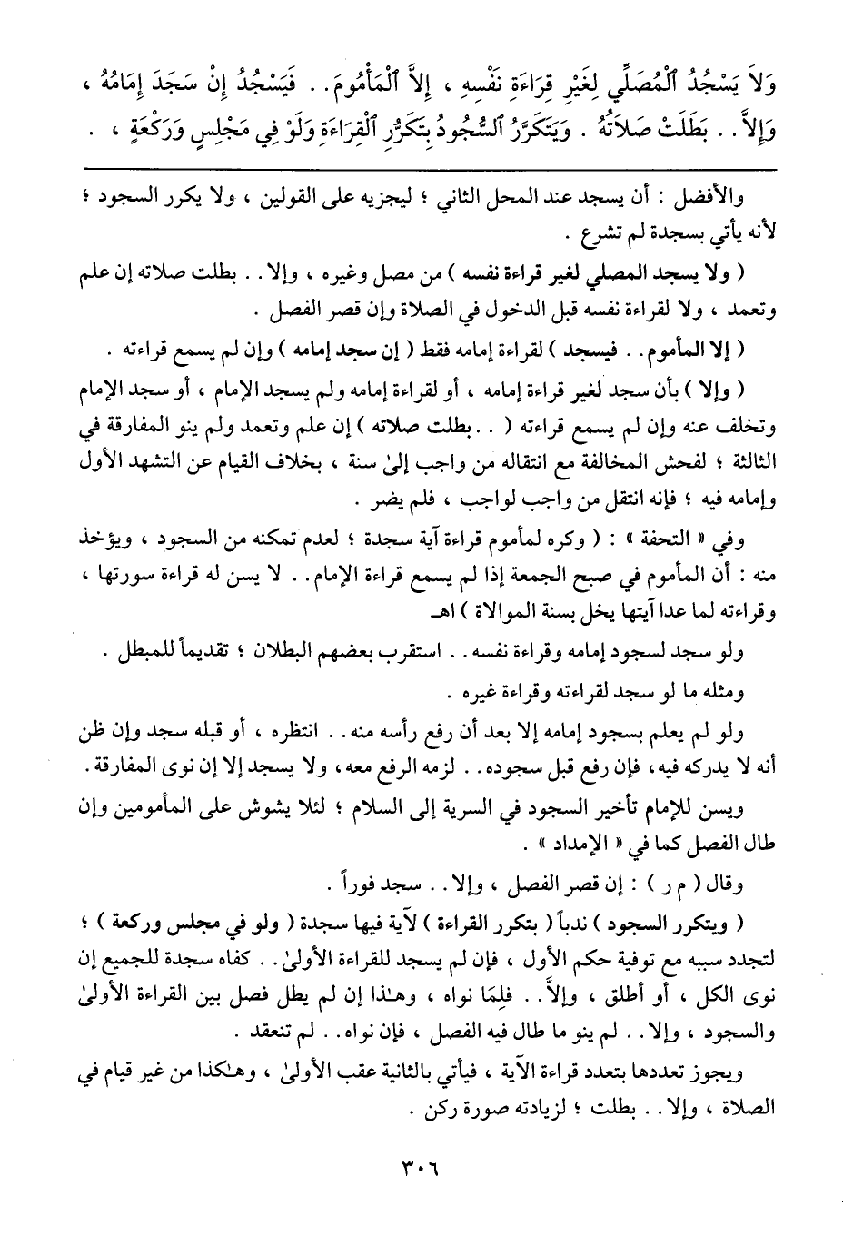 (ولا يسجد المصلي لغير قراءة نفسه) من مصل وغيره، وإلا .. بطلت صلاته إن علم وتعمد، ولا لقراءة نفسه قبل الدخول في الصلاة وإن قصر الفصل.