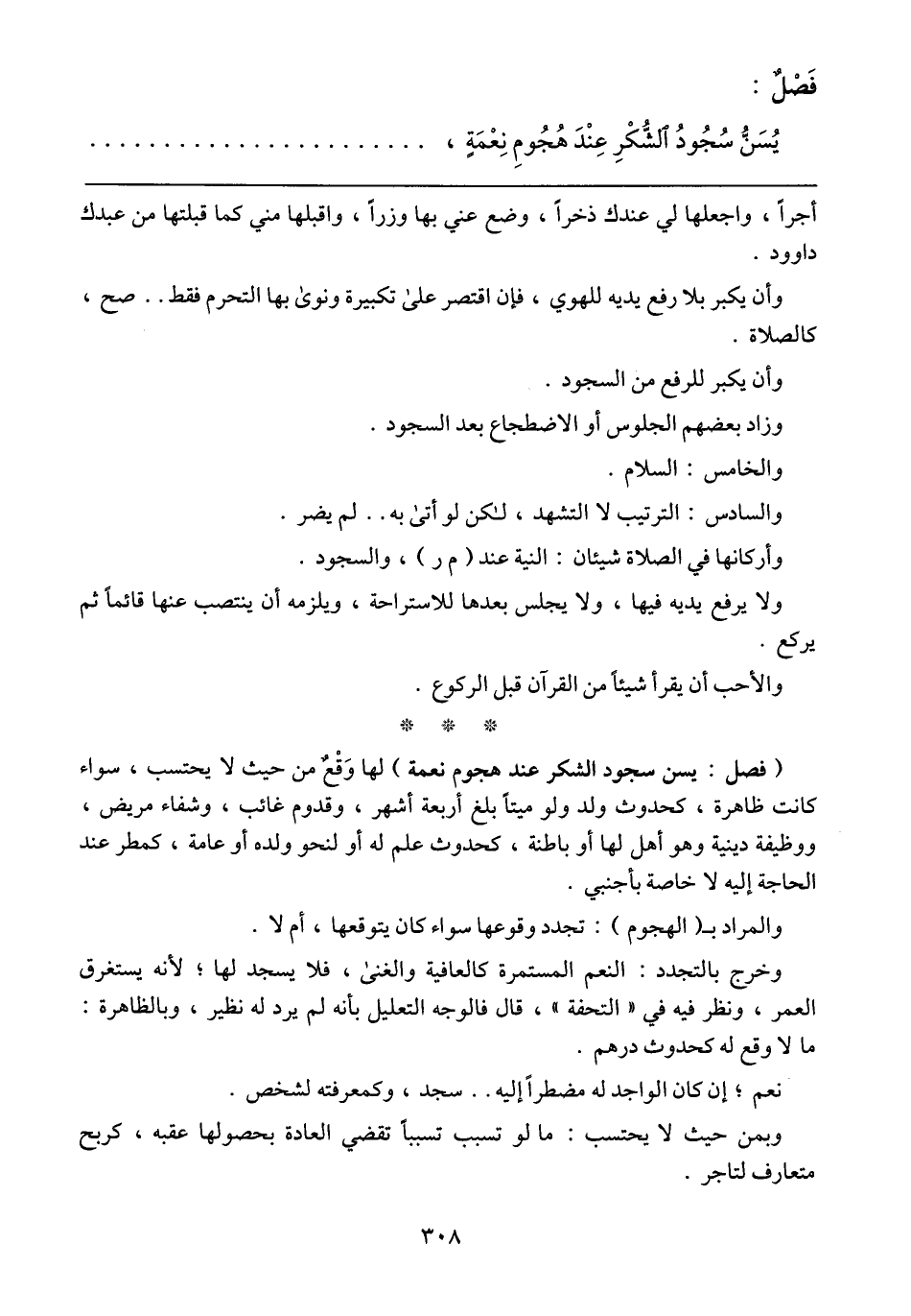 (فصل: يسن سجود الشكر عند هجوم نعمة) لها وقْعٌ من حيث لا يحتسب، سواء كانت ظاهرة، كحدوث ولد ولو ميتاً بلغ أربعة أشهر، وقدوم غائب، وشفاء مريض، ووظيفة دينية وهو أهل لها أو باطنة، كحدوث علم له أو لنحو ولده أو عامة، كمطر عند الحاجة إليه لا خاصة بأجنبي.