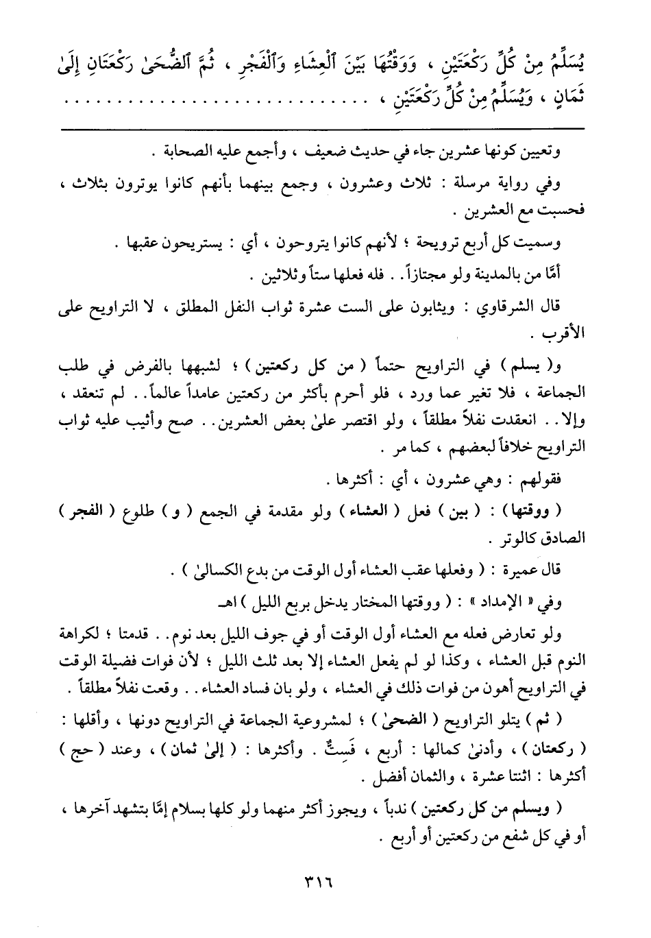 و (يسلم) في التراويح حتماً (من كل ركعتين)؛ لشبهها بالفرض في طلب الجماعة، فلا تغير عما ورد، فلو أحرم بأكثر من ركعتين عامداً عالماً .. لم تنعقد، وإلا .. انعقدت نفلاً مطلقاً، ولو اقتصر على بعض العشرين .. صح وأثيب عليه ثواب التراويح خلافاً لبعضهم، كما مر.