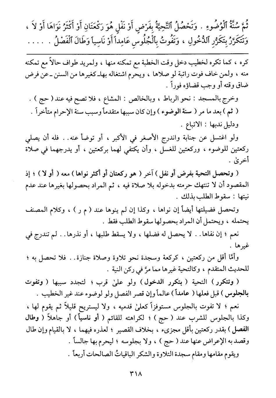 (وتتكرر) التحية (بتكرر الدخول) ولو على قرب؛ لتجدد سببها (وتفوت بالجلوس) قبل فعلها (عامداً) عالماً وإن قصر الفصل ولو لوضوء عند غير الخطيب.