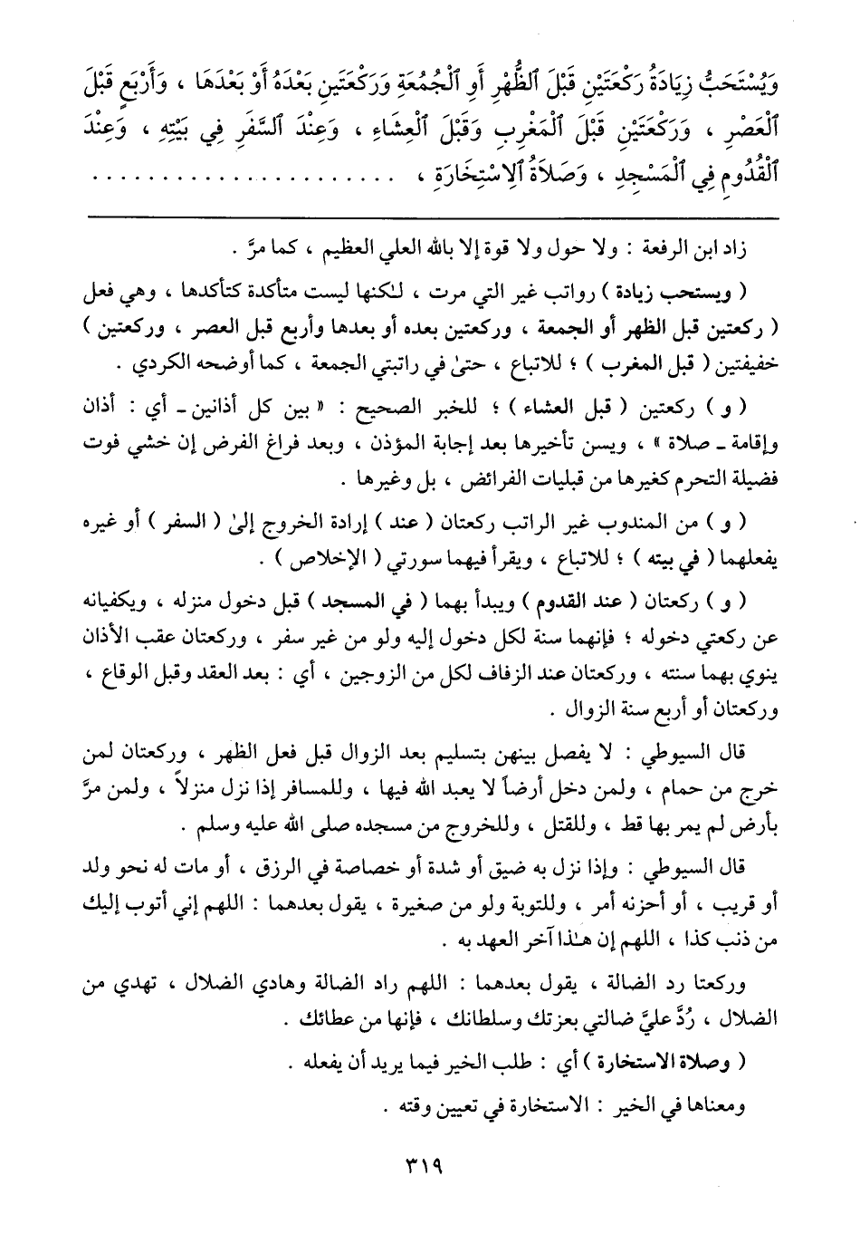 (ويستحب زيادة) رواتب غير التي مرت، لكنها ليست متأكدة كتأكدها، وهي فعل (ركعتين قبل الظهر أو الجمعة، وركعتين بعده أو بعدها وأربع قبل العصر، وركعتين) خفيفتين (قبل المغرب)؛ للاتباع، حتى في راتبتي الجمعة، كما أوضحه الكردي.
