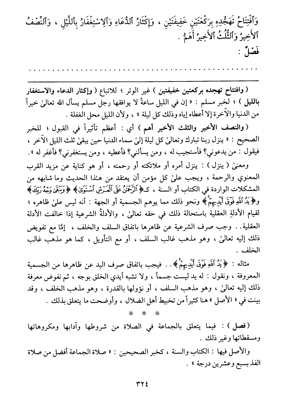 ومعنى (ينزل): ينزل أمره أو ملائكته أو رحمته، أو هو كنايه عن مزيد القرب المعنوي والرحمة، ويجب على كل مؤمن أن يعتقد من هذا الحديث وما شابهه من المشكلات الواردة في الكتاب والسنة، كـ (الرَّحْمَنُ عَلَى الْعَرْشِ اسْتَوَى) [طه:5] (وَيَبْقَى وَجْهُ رَبِّكَ) [الرحمن:27] و (يَدُ اللَّهِ فَوْقَ أَيْدِيهِمْ) [الفتح:10] ونحو ذلك مما يوهم الجسمية أو الجهة: أنه ليس على ظاهرة؛ لقيام الأدلة العقلية باستحالة ذلك في حقه تعالى، والأدلة الشرعية إذا خالفت الأدلة العقلية .. وجب صرف الشرعية عن ظاهرها باتفاق السلف والخلف، إمَّا مع تفويض ذلك إليه تعالى، وهو مذهب غالب السلف، أو مع التأويل، كما هو مذهب غالب الخلف.