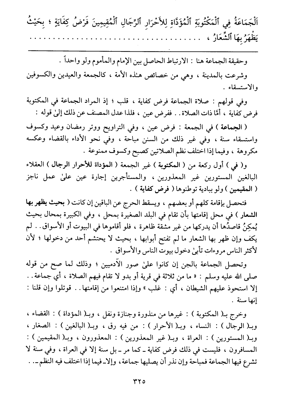 (الجماعة) في الجمعة: فرض عين، وفي التراويح ووتر رمضان وعيد وكسوف واستسقاء سنة، وفي غير ذلك من السنن مباحة، وفي نحو الأداء بالقضاء وعكسه مكروهة، وفيما إذا اختلف نظم الصلاتين كصبح وكسوف ممنوعة.