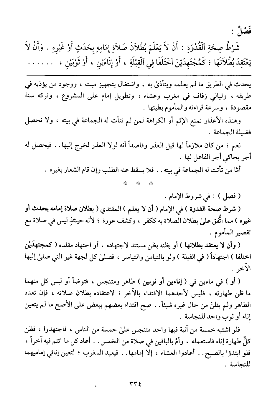(شرط صحة القدوة) في الإمام (أن يعلم) المقتدي (بطلان صلاة إمامه بحدث أو غيره) مما اتُّفق على بطلان الصلاة به ككفر، وكشف عورة؛ لأنه حينئذٍ ليس في صلاة مع تقصير المأموم.