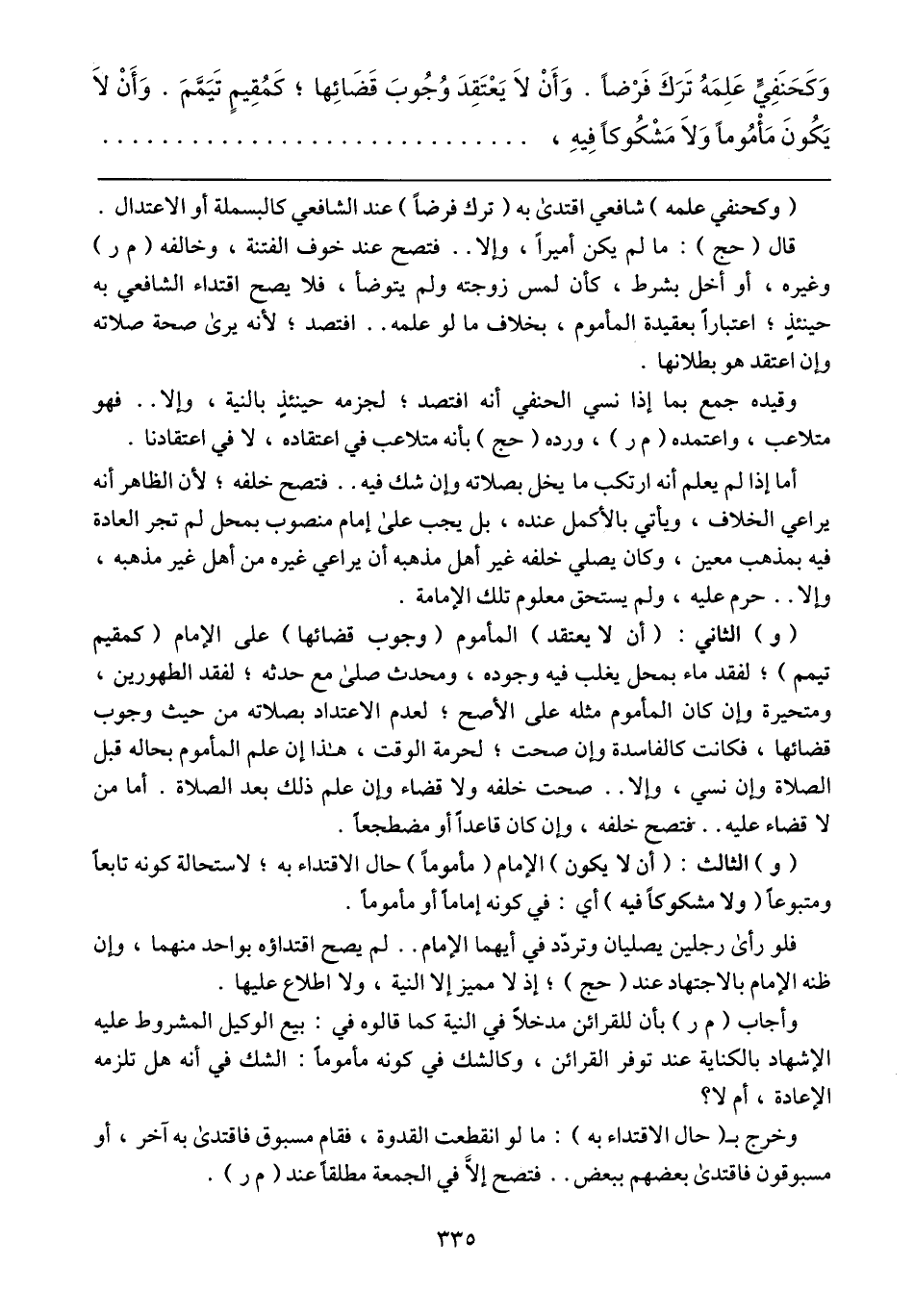 قال (حج): ما لم يكن أميراً، وإلا .. فتصح عند خوف الفتنة، وخالفه (م ر) وغيره، أو أخل بشرط، كأن لمس زوجته ولم يتوضأ، فلا يصح اقتداء الشافعي به حينئذٍ؛ اعتباراً بعقيدة المأموم، بخلاف ما لو علمه .. افتصد؛ لأنه يرى صحة صلاته وإن اعتقد هو بطلانها.