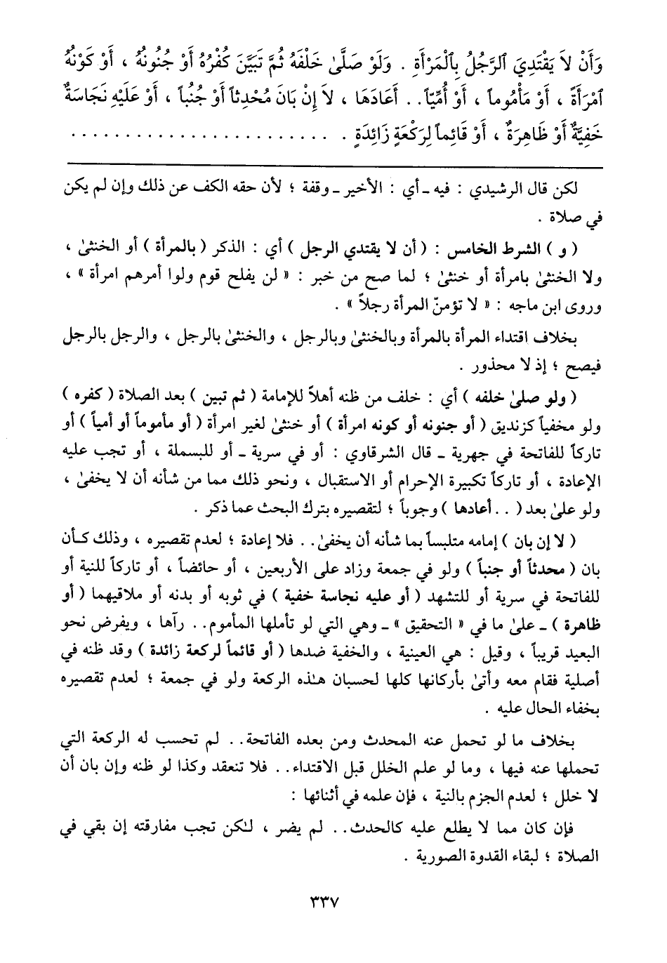 (و) الشرط الخامس: (أن لا يقتدي الرجل) أي: الذكر (بالمرأة) أو الخنثى، ولا الخنثى بامرأة أو خنثى؛ لما صح خبر: "لن يفلح قوم ولوا أمرهم امرأة"، وروى ابن ماجه: "لا تؤمنّ المرأة رجلاً".