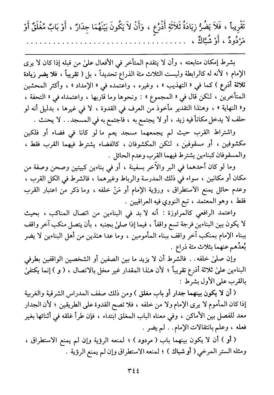 بشرط إمكان متابعته، وأن لا يتقدم المتأخر في الأفعال على من قبله إذا كان لا يرى الإمام؛ لأنه له كالرابطة وليست الثلاث مئة الذراع تحديداً، بل (تقريباً، فلا يضر زيادة ثلاثة أذرع) كما في "التهذيب"، وغيره، واعتمده في "الإمداد"، وأكثر المحشين المتأخرين، لكن قال في "المجموع": ونحوها وما قاربها، واعتمداه في "التحفة"، و"النهاية"، وهذا التقدير مأخوذ من العرف في القدوة، لا في غيرها، بدليل أنه لو حلف لا يدخل مكاناً فيه زيد، أو لا يجتمع به، فاجتمع به في المسجد .. لا يحنث.