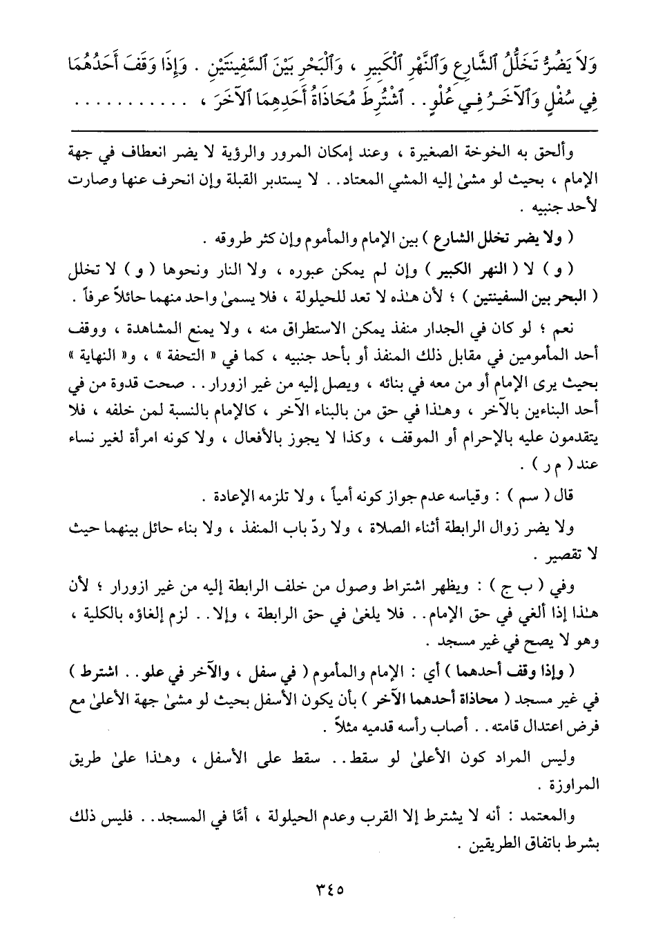 وألحق به الخوخة الصغيرة، وعند إمكان المرور والرؤية لا يضر انعطاف في جهة الإمام، بحيث لو مشى إليه المشي المعتاد .. لا يستدبر القبلة وإن انحرف عنها وصارت لأحد جنبيه.