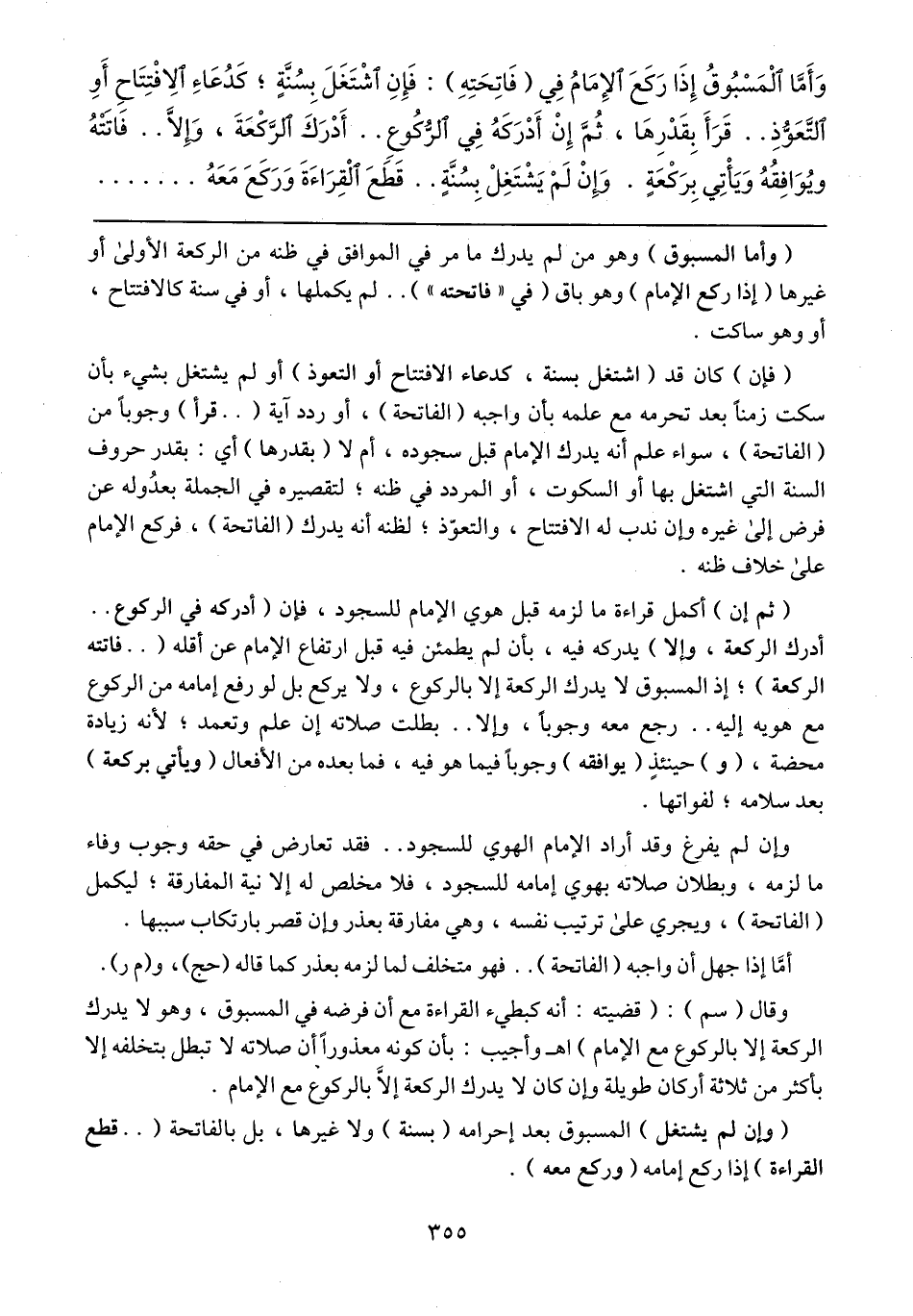 وقال (سم): (قضيته: أنه كبطيء القراءة مع أن فرضه في المسبوق، وهو لا يدرك الركعة إلا بالركوع مع الإمام) اهـ وأجيب: بأن كونه معذوراً أن صلاته لا تبطل بتخلفه إلا بأكثر من ثلاثة أركان طويلة وإن كان لا يدرك الركعة إلاَّ بالركوع مع الإمام.