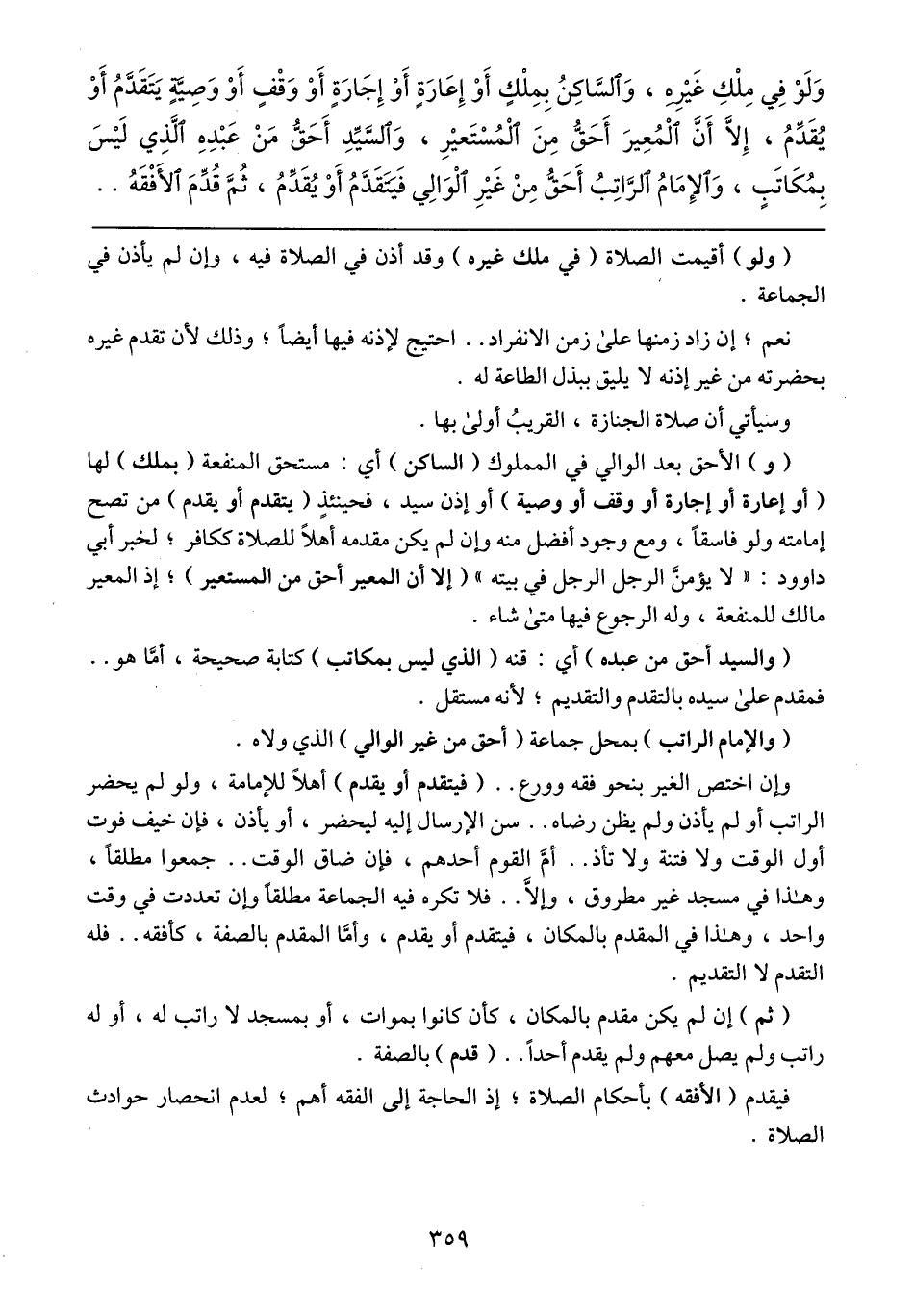 وإن اختص الغير بنحو فقه وورع .. (فيتقدم أو يقدم) أهلاً للإمامة، ولو لم يحضر الراتب أو لم يأذن ولم يظن رضاه .. سن الإرسال إليه ليحضر، أو يأذن، فإن خيف فوت أول الوقت ولا فتنة ولا تأذ .. أمَّ القوم أحدهم، فإن ضاق الوقت .. جمعوا مطلقاً، وهذا في مسجد غير مطروق، وإلا .. فلا تكره فيه الجماعة مطلقاً وإن تعددت في وقت واحد، وهذا في المقدم بالمكان، فيتقدم أو يقدم، وأمَّا المقدم بالصفة، كأفقه .. فله التقدم لا التقديم.