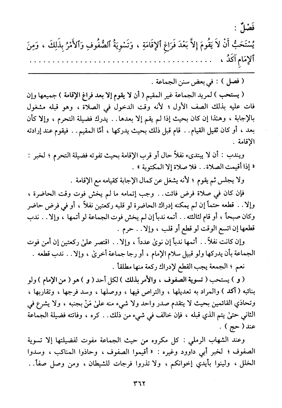 وعند الشهاب الرملي: كل مكروه من حيث الجماعة مفوت لفضيلتها إلا تسوية الصفوف؛ لخبر أبي داوود وغيره: "أقيموا الصفوف، وحاذوا المناكب، وسدوا الخلل، ولينوا بأيدي إخوانكم، ولا تذروا فرجات للشيطان، ومن وصل صفاً ..