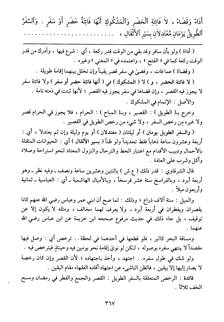 قال الشرقاوي: قدر ذلك (ع ش) باثنين وعشرين ساعة ونصف -وفيه نظر- وهو أربعة أبرد، وبالفراسخ ستة عشر فرسخاً، وبالأميال الهاشمية -أي: العباسية- ثمانية وأربعون ميلاً.