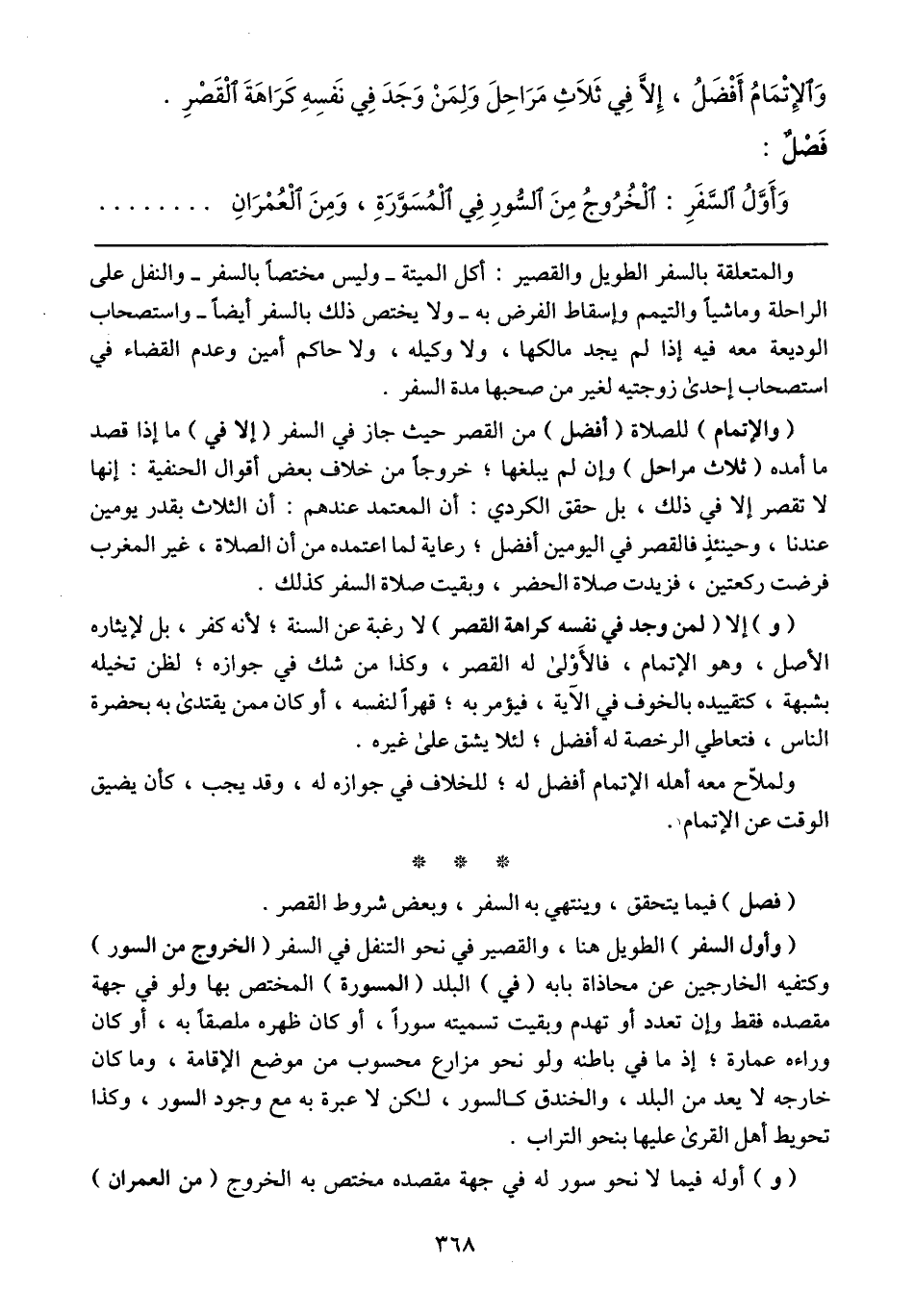 (والإتمام) للصلاة (أفضل) من القصر حيث جاز في السفر (إلا في) ما إذا قصد ما أمده (ثلاث مراحل) وإن لم يبلغها؛ خروجاً من خلاف بعض أقوال الحنفية: إنها لا تقصر إلا في ذلك، بل حقق الكردي: أن المعتمد عندهم: أن الثلاث بقدر يومين عندنا، وحينئذٍ فالقصر في اليومين أفضل؛ رعاية لما اعتمده من أن الصلاة، غير المغرب فرضت ركعتين، فزيدت صلاة الحضر، وبقيت صلاة السفر كذلك.